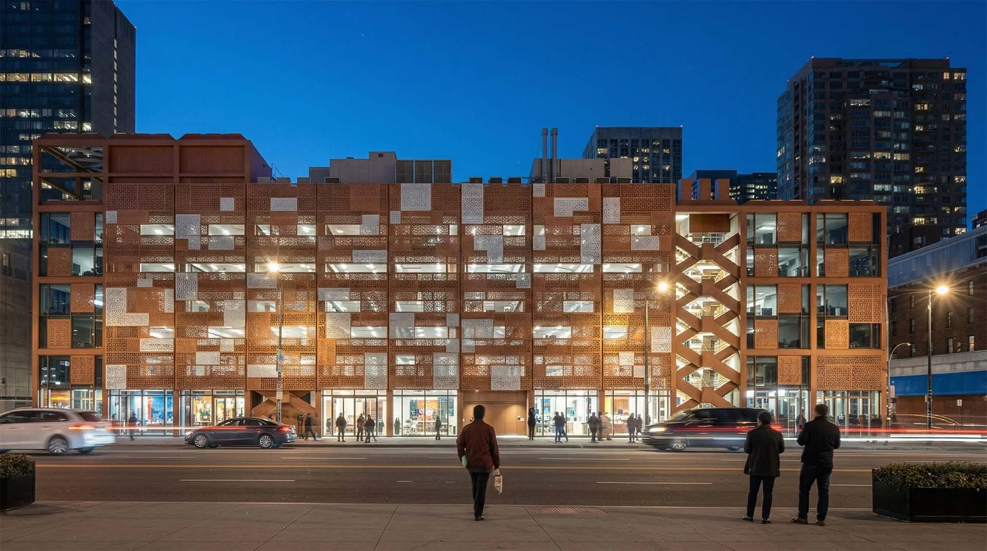 La organización espacial se estructura en torno a la sala de conciertos como núcleo central, rodeada por la trama modular que aloja aulas, salas de ensayo, administración y circulaciones, como una secuencia de espacios diáfanos, con elevada calidad lumínica y ambiental. El módulo estructural de doble altura permite subdivisiones horizontales cuando es necesario, asegurando máxima flexibilidad funcional. La envolvente principal es completamente vidriada, favoreciendo la iluminación natural y la continuidad visual con el exterior. En las fachadas laterales, aparece una doble fachada tecnológica suspendida, formada por una subestructura metálica y un modulado de piezas metálicas traslúcidas coloreadas, tamiza la luz y confiere identidad al edificio. Durante la noche, la iluminación interior atraviesa esta piel, transformando el volumen en un referente cultural vibrante en el paisaje urbano. La cubierta se resuelve mediante grandes módulos prefabricados que funcionan como “tapas estructurales”, adoptando configuraciones específicas según su función: lucernarios para iluminación cenital controlada, módulos con ventilación integrada, o bien áreas de cubierta ajardinada transitable que amplían el programa hacia el plano superior, que aporta una nueva plaza verde, inexistente en el entorno urbano de acceso.